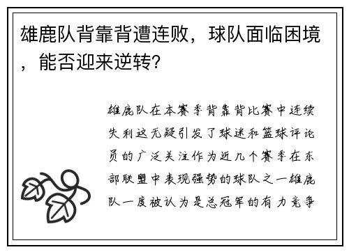 雄鹿队背靠背遭连败,球队面临困境,能否迎来逆转?
