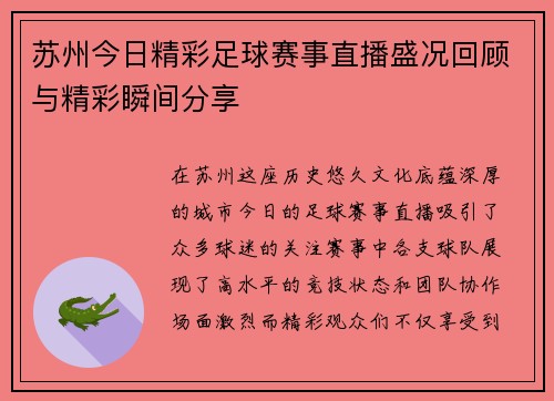 苏州今日精彩足球赛事直播盛况回顾与精彩瞬间分享