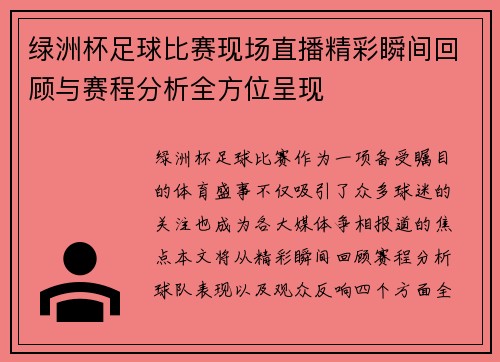 绿洲杯足球比赛现场直播精彩瞬间回顾与赛程分析全方位呈现
